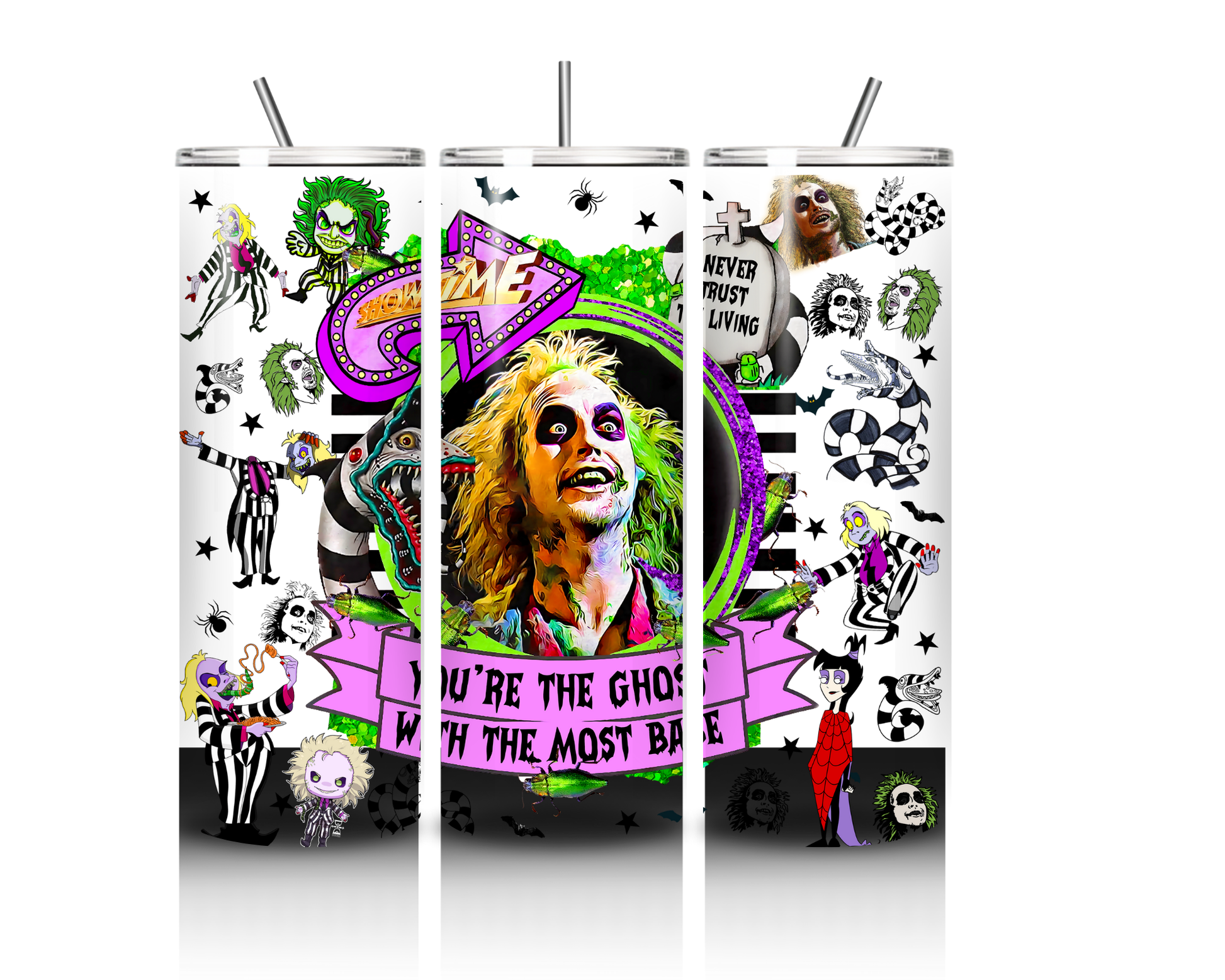 This 20 oz Beetlejuice tumbler is perfect for keeping your drinks hot or cold on the go. Made from durable materials, it is designed to last and is easy to carry with you wherever you go. With its sleek design, it's a stylish and practical choice for any beverage.